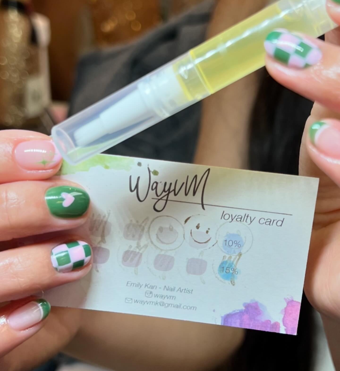 1 stamp for every full service received. Discounts every 5th time we meet and a free cuticle oil pen (personal favorite mix) every 10th appointment.